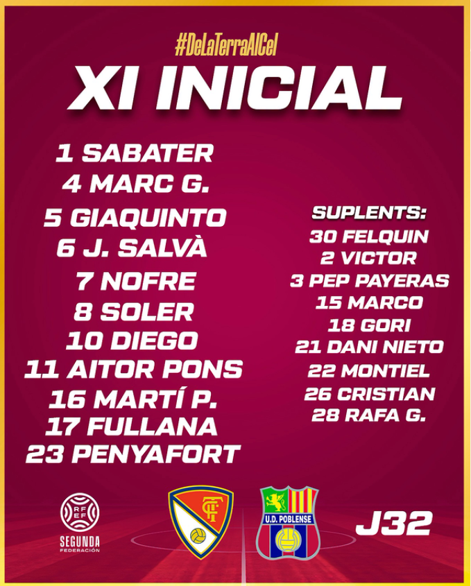 1. Sabater / 4. Marc García; 16. Martí Payeras; 6. Joan Salvà / 7. Onofre; 17. Xesc Fullana; 8. Soler; 5. Giaquinto; 10. Diego Martínez / 23. Toni Penyafort; 11. Aitor Pons (C)