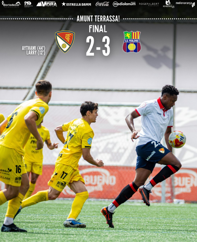 Los egarenses iban ya a la desesperada, pero no lograban generar el peligro que querían. Todo juntado que el Poblense se cerraba cada vez más, no ayudaba a que llegaran con peligro. Se levantaba el cartelón y se añadirían siete minutos más. El recién entrado Víctor recibiría tarjeta. También lo haría el arquero visitante por perder tiempo. Y aunque pareciera imposible, con todo el Terrassa volcado en ataque, llegó lo que nadie en el campo deseaba, el gol del Poblense. Un gol que dejaba a los locales prácticamente sin opción a playoff. Finalmente, se acabaría uno de los partidos más locos de la temporada, con el sueño de una ciudad derrumbado. Resultado final: 2-3.