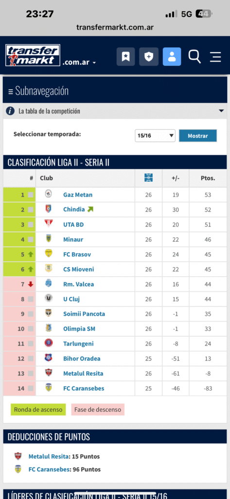 | Caransebeș (Rumanía) | 2015‑16 | Liga II | 96 | Impagos y retirada, múltiples sanciones acumuladas. |
