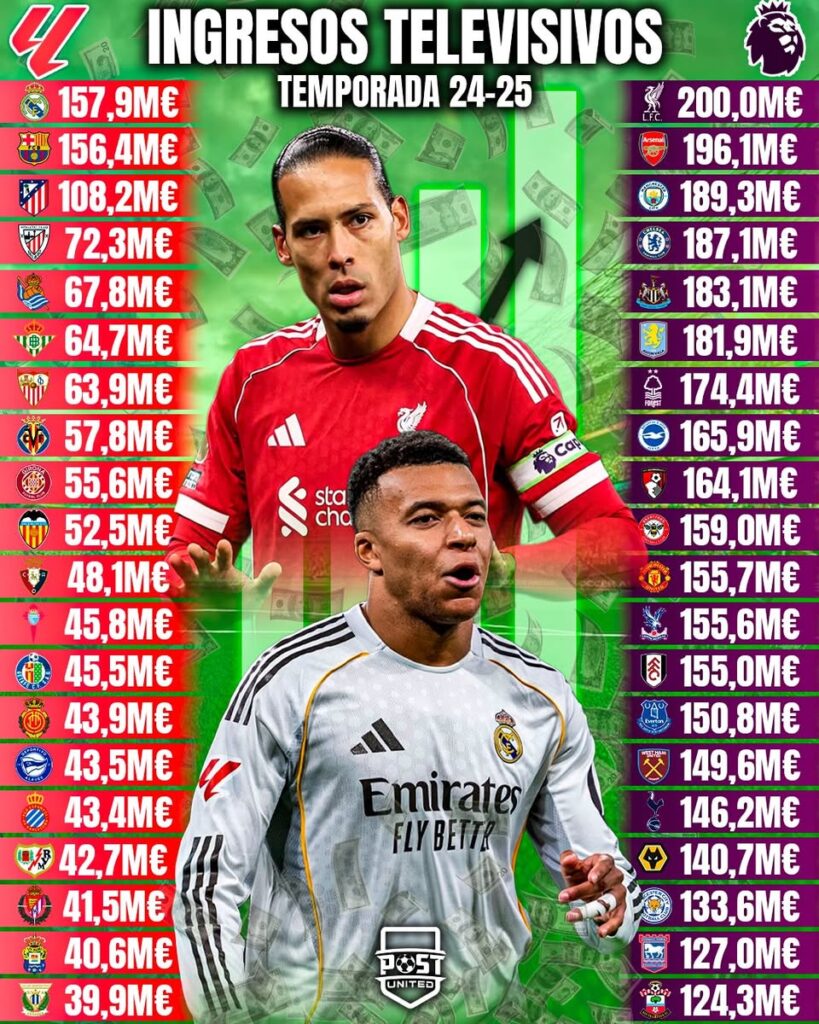 Y tan sólo hay que mirar la valoración de cada competición y la forma de repartir los ingresos: mientras LaLiga está valorada, según SportingPedia en algo más de 5.000 millones de euros, la Premier llega hasta los 11.770 millones de euros.