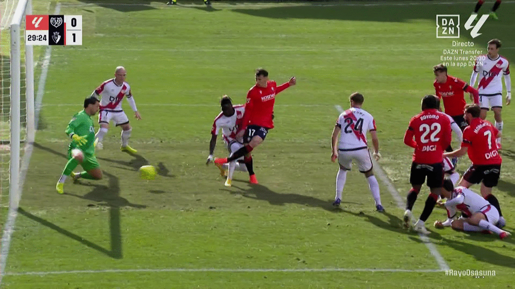 Desde el inicio del partido pudimos ver dos propuestas muy parecidas en el estilo,intensidad en la presión y contraataques eléctricos buscando sorprender a las defensas,las primera ocasión fue a favor del Rayo por medio de Jorge de Frutos que no pudo transformar el centro lateral de su compañero Isi,con el paso de los minutos se fue estabilizando el partido y el alto ritmo impuesto por ambos equipos fue bajando,las ocasiones eran escasas,los chicos de Iñigo insistían con el arma del centro lateral pero los defensas de Osasuna evitaban cualquier remate a la portería de Sergio Herrera. La primera ocasión del conjunto pamplonica llegaría en un disparo muy lejano de Victor Muñoz que se marchaba desviado justo antes de la oportunidad más clara de Osasuna para abrir el marcador,una internada de Javi Galan que se convirtió en extremo deshaciéndose de los rivales que finalizó con un disparo repelido por Batalla. En el propio saque de esquina posterior fue donde Ante Budimir adelantará a su equipo en el marcador,el balón fue hasta el segundo palo donde la peleó Moncayola y en el rebote fue el delantero croata quien mandó el balón al fondo de la red,quinto gol para el ariete en lo que llevamos de competición doméstica,máximo goleador del conjunto dirigido por Alessio Lisci.