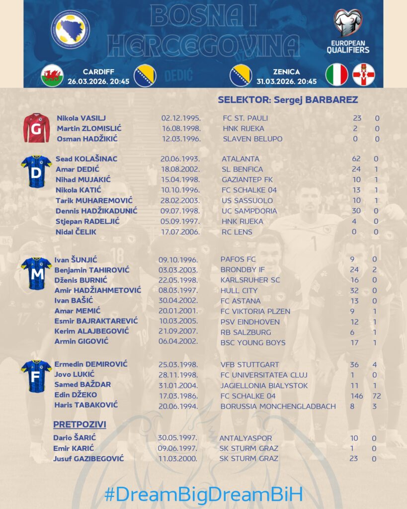 Dzeko, Kolasinac y compañía quieren buscar ante Gales la proeza de entrar por segunda vez en su historia a la gran cita mundialista. Los de Sergej Barbarez contarán con una plantilla con bastantes jóvenes, donde destacan por su gran momento el central Tarik Muharemovic del Sassuolo o el extremo de 18 años Kerim Alajbegovic del Salzburgo. Los bosnios pretenderán mantener la buena sintonía de sus 3 últimos compromisos: dos victorias ante Malta y Rumanía y un meritorio empate frente a Austria.