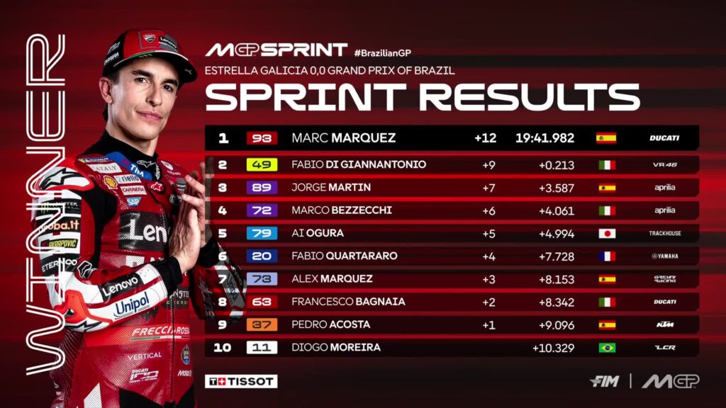 Finalmente, Marc Márquez se llevó la victoria en la Sprint del GP de Brasil tras una batalla espectacular, cruzando la meta con apenas dos décimas de ventaja sobre Di Giannantonio.Jorge Martín completó el podio en tercera posición, culminando una carrera muy sólida.