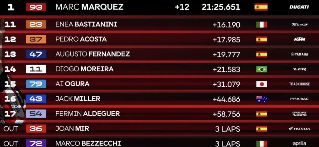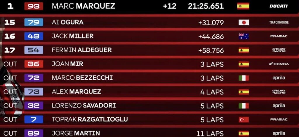 Lo que parecía el final de sus opciones se convirtió en el inicio de una remontada memorable. Aprovechando el desconcierto general y las caídas de rivales directos, como Álex Márquez o Marco Bezzecchi, Márquez comenzó a recuperar posiciones.