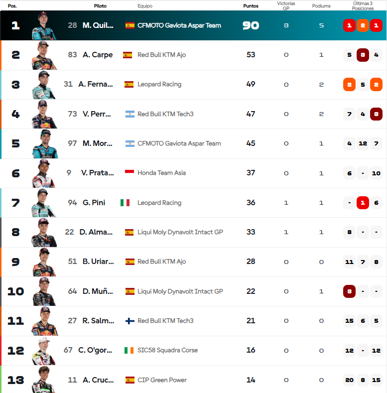 Tras la bandera y la línea de meta, el ganador fue Quiles con una superioridad apabullante. Hubo ‘photo-finish‘ para decretar el podio. Quiles ha estado acompañado por Adrián Fernández en segundo lugar y el bronce fue para David Muñoz. Así queda el mundial de Moto3 tras la 4ta carrera: