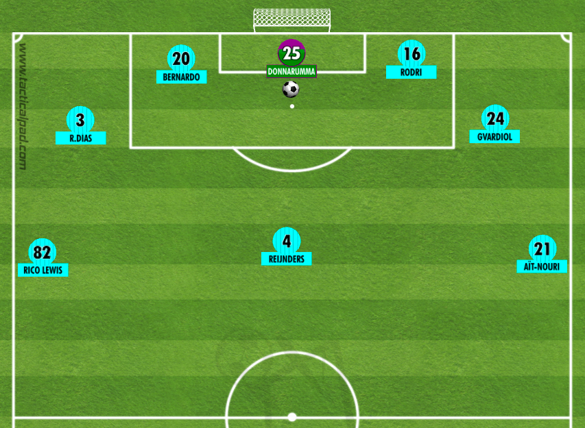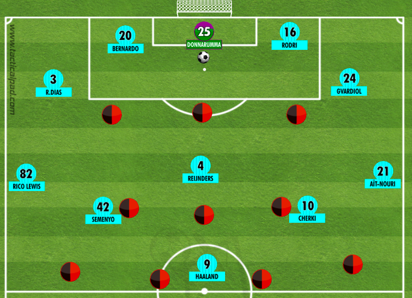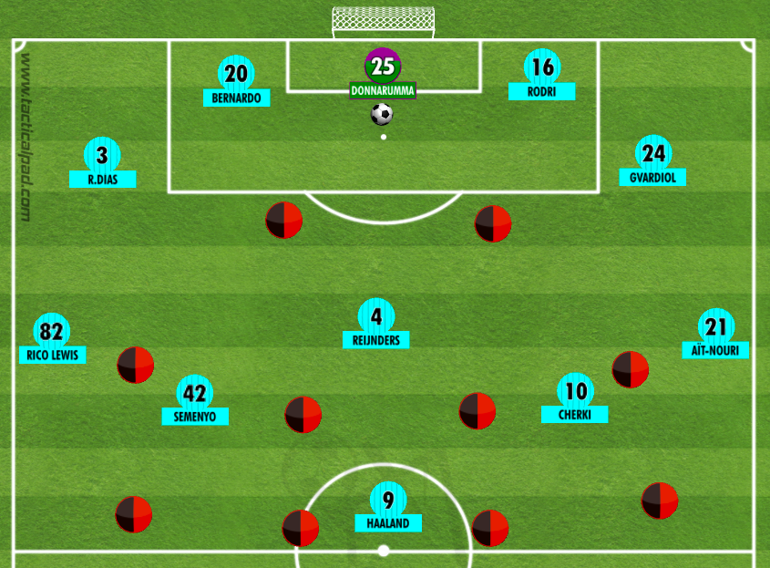 En la imagen, podemos ver lo que sería una disposición contra un equipo que, por ejemplo, presionara la salida de balón con dos delanteros y se asentara en un 1-4-4-2. Aquí, las posiciones de Sementó y Cherki también son clave, pues obligan a fijar a los dos medio centro rivales y que Reijnders pueda ejercer de hombre libre (en teoría). Rico Lewis y Aït-Nouri se encargan de fijar a los extremos rivales y esto dejaría una posible proyección más libre a los centrales para salir por fuera.